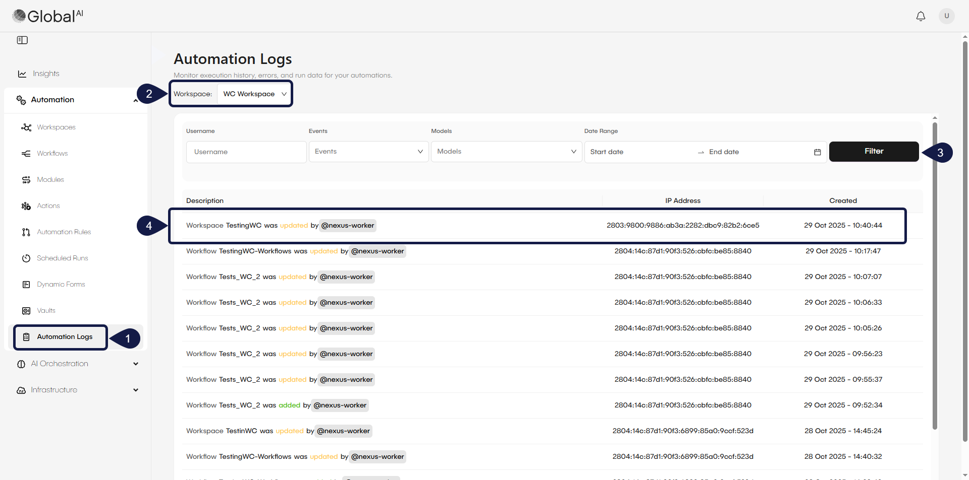 - If prompted, select a Workspace from the modal window or dropdown menu. The Automation Logs page displays, showing a complete record of changes.