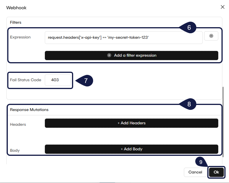 403(Forbidden). Some third-party platforms (like Slack or HubSpot) will monitor for these "failure" responses and may automatically disable your webhook if it receives too many403errors. - The solution: To prevent this, you can set the Rejection Status Code to