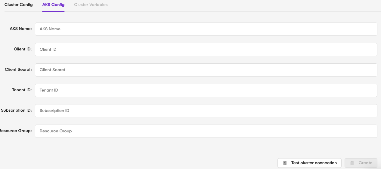 - On the AKS (Azure Kubernetes Service) Config tab, fill the required details to connect an AKS cluster to GlobalAI: