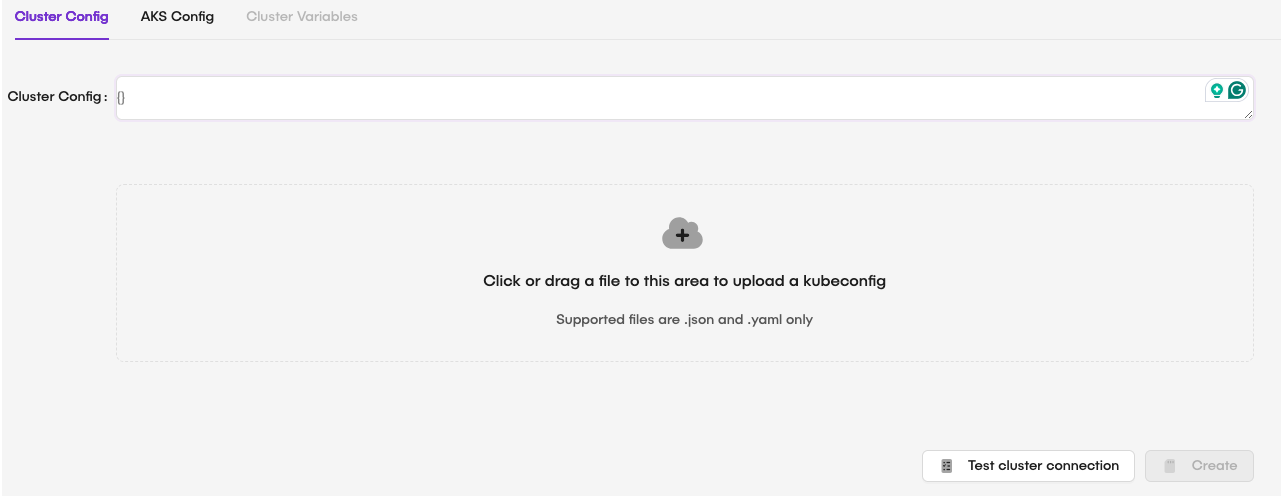 Before you can use the cluster, you need to configure the connection settings. To do this, you have option: Cluster Config or AKS Config.